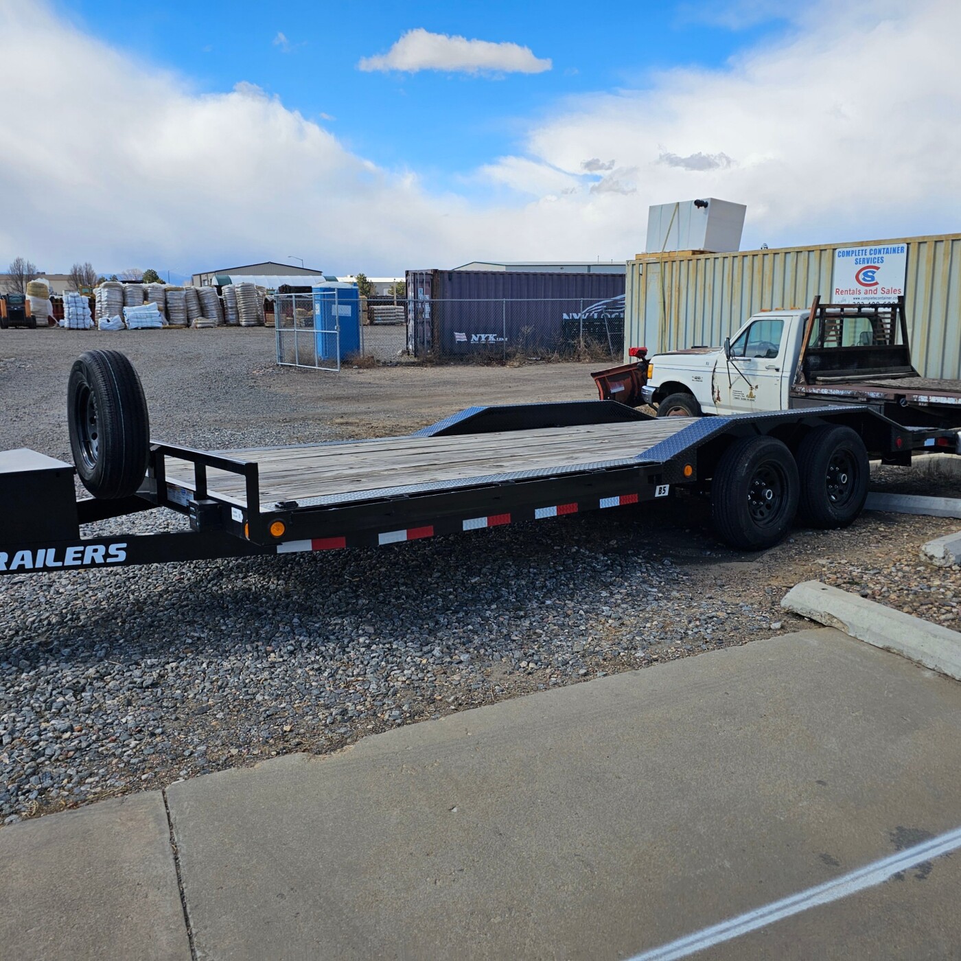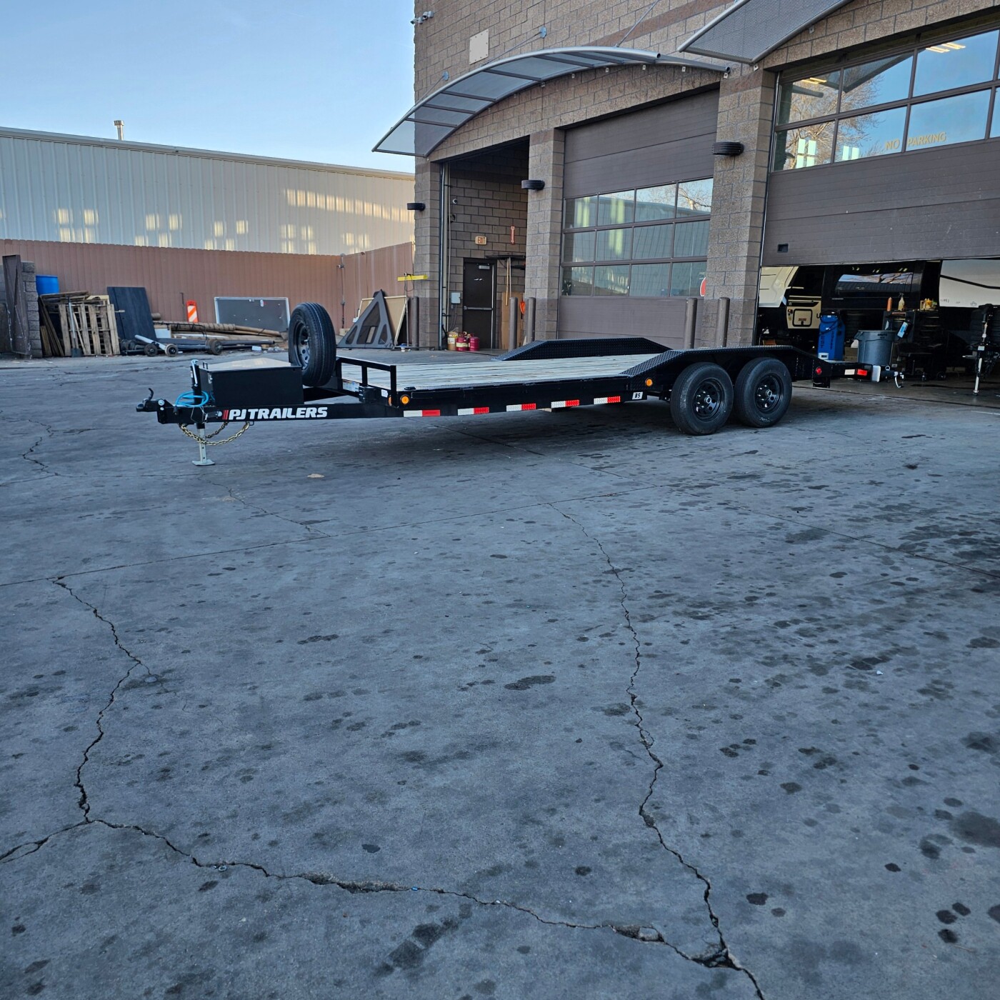2ft x 8.5ft 10K GVWR car hauler, 7,450lb payload. Includes pull-out ramps & toolbox, spare Tire. weld on D rings, straps included.
