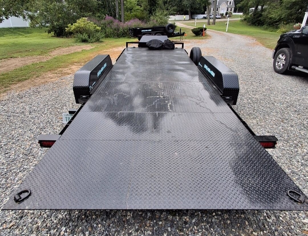 Hydraulic tilt deck car trailer, 7x20 with removable fenders for easy loading of most low profile vehicles. Knife edge deck design gives a smooth transition from ground to full metal deck. Includes a 12K lb winch for loading or unloading of non running vehicles. All straps and winch tools included with rental. (4) corner 3" D-rings at each corner.