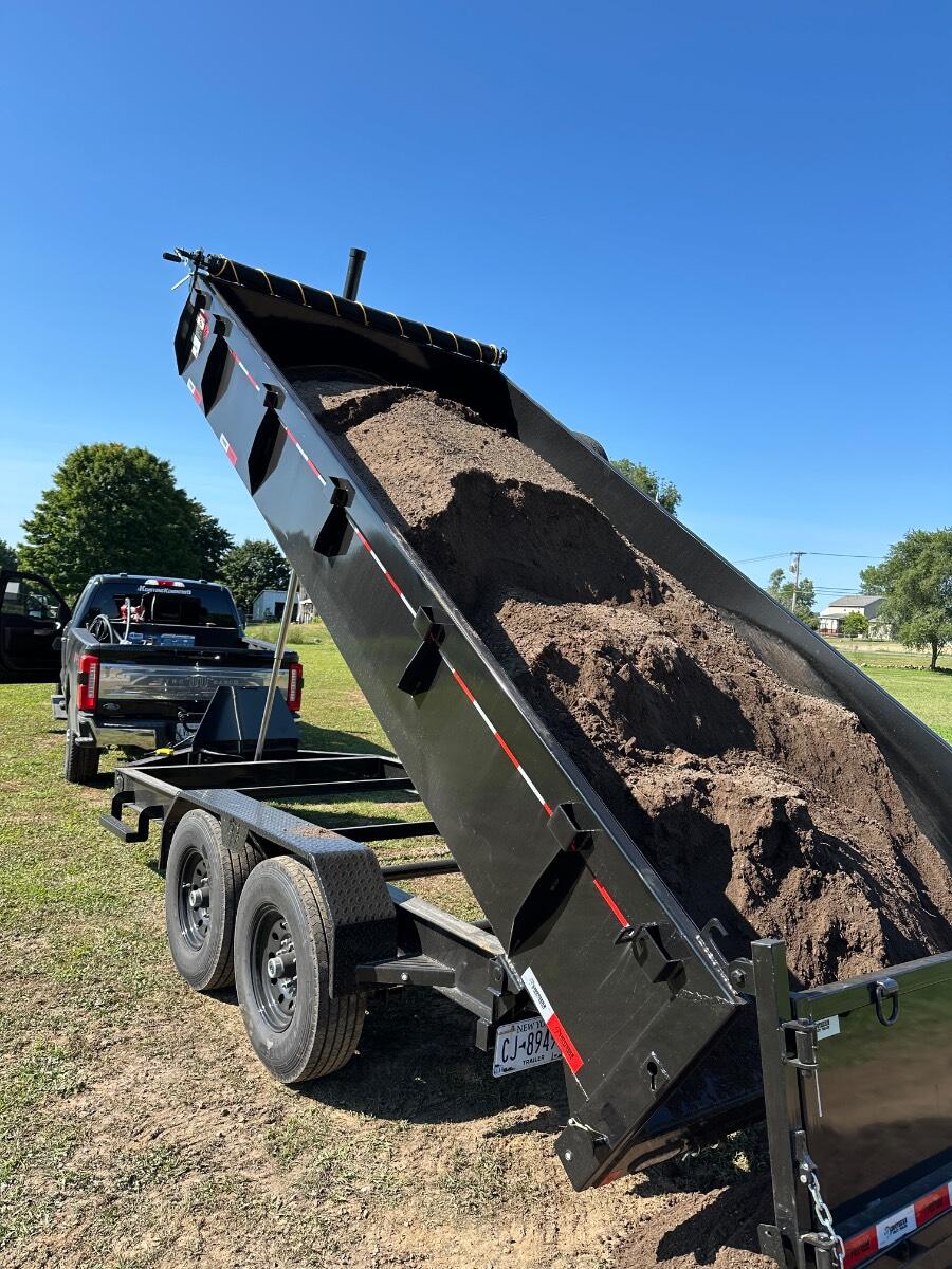 16’ Southern Utility Dump Trailer. Very heavy duty dump trailer with high load rating tires, and a single front ram for dumping heavy dirt, stone, or anything you can put in it.
