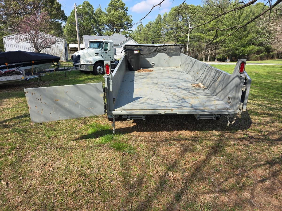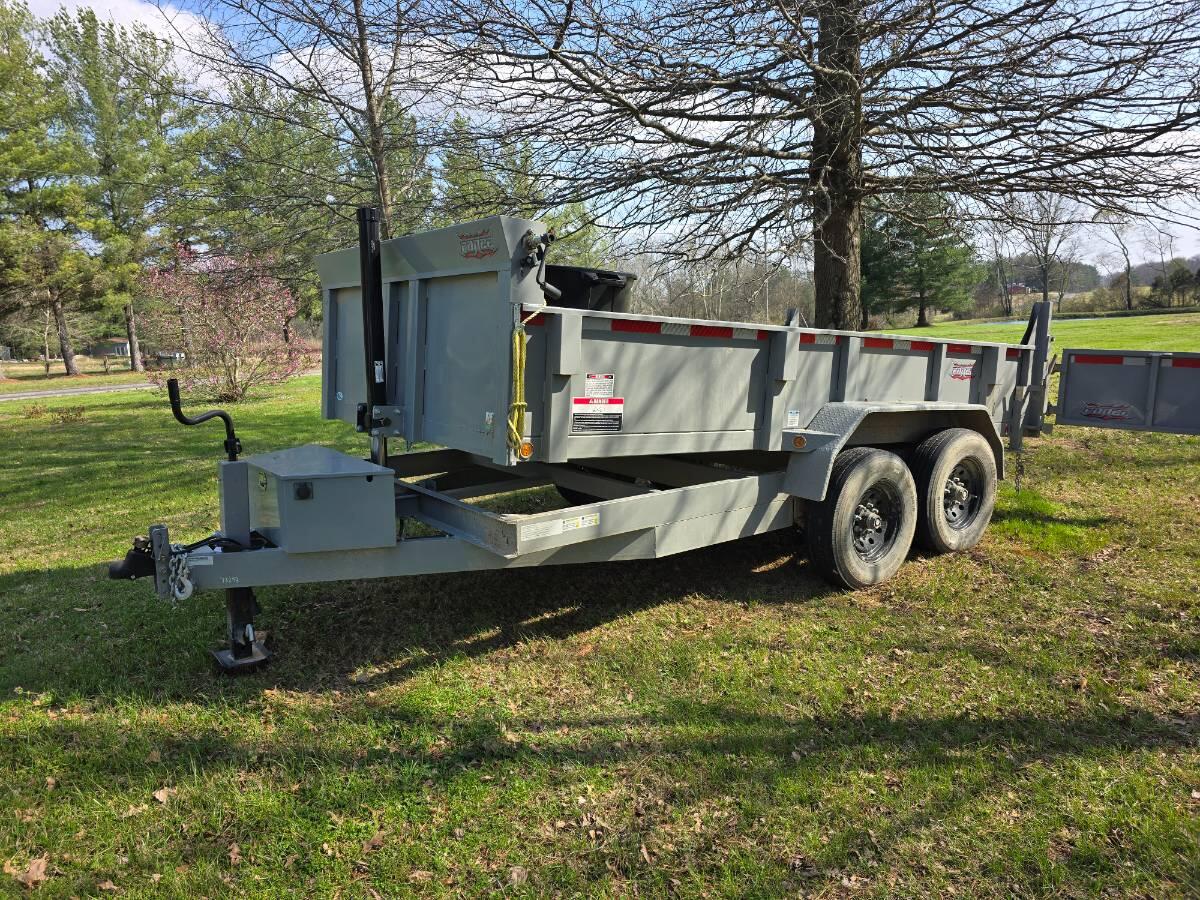 Trailer will stand straight up to dump. Has barn doors as well as swing with spreading chains, has a roll cover, was sent bsck to forest river for more reinforcement to handle higher capacity loads, has ramps and tie downs . Would recommend a 2500 and up truck to haul if hauling more than 5 tons . Check your truck tow capacity.