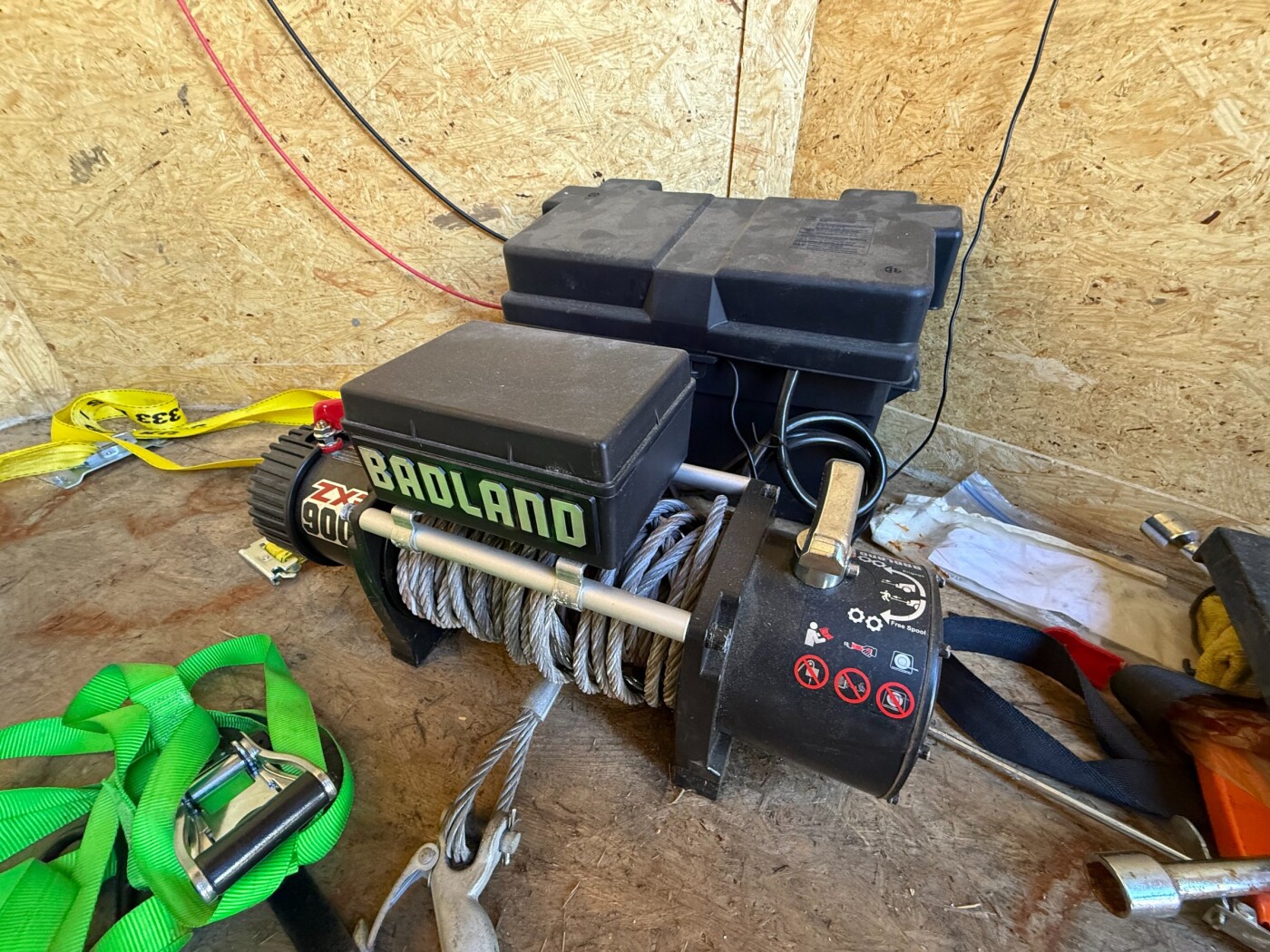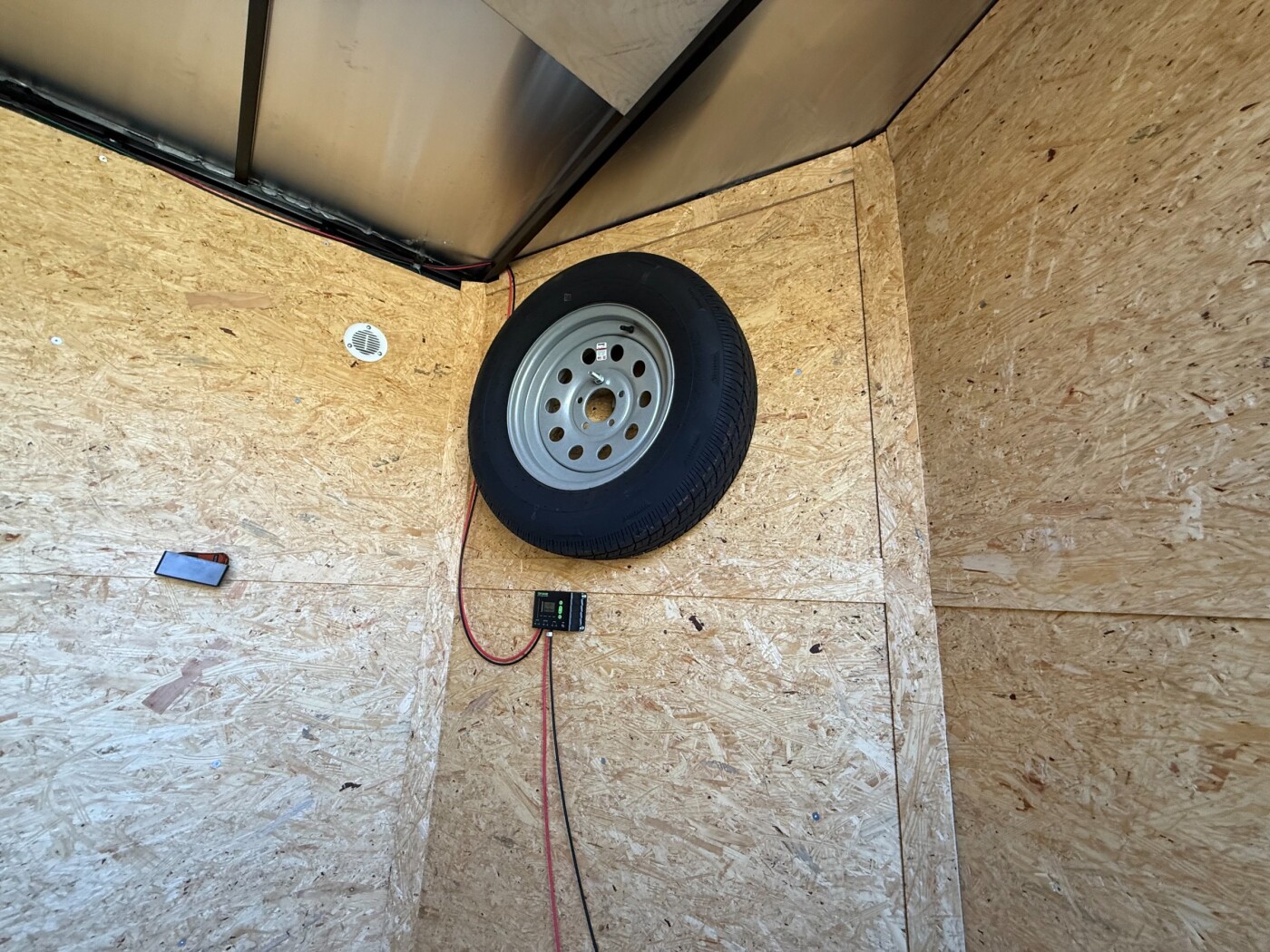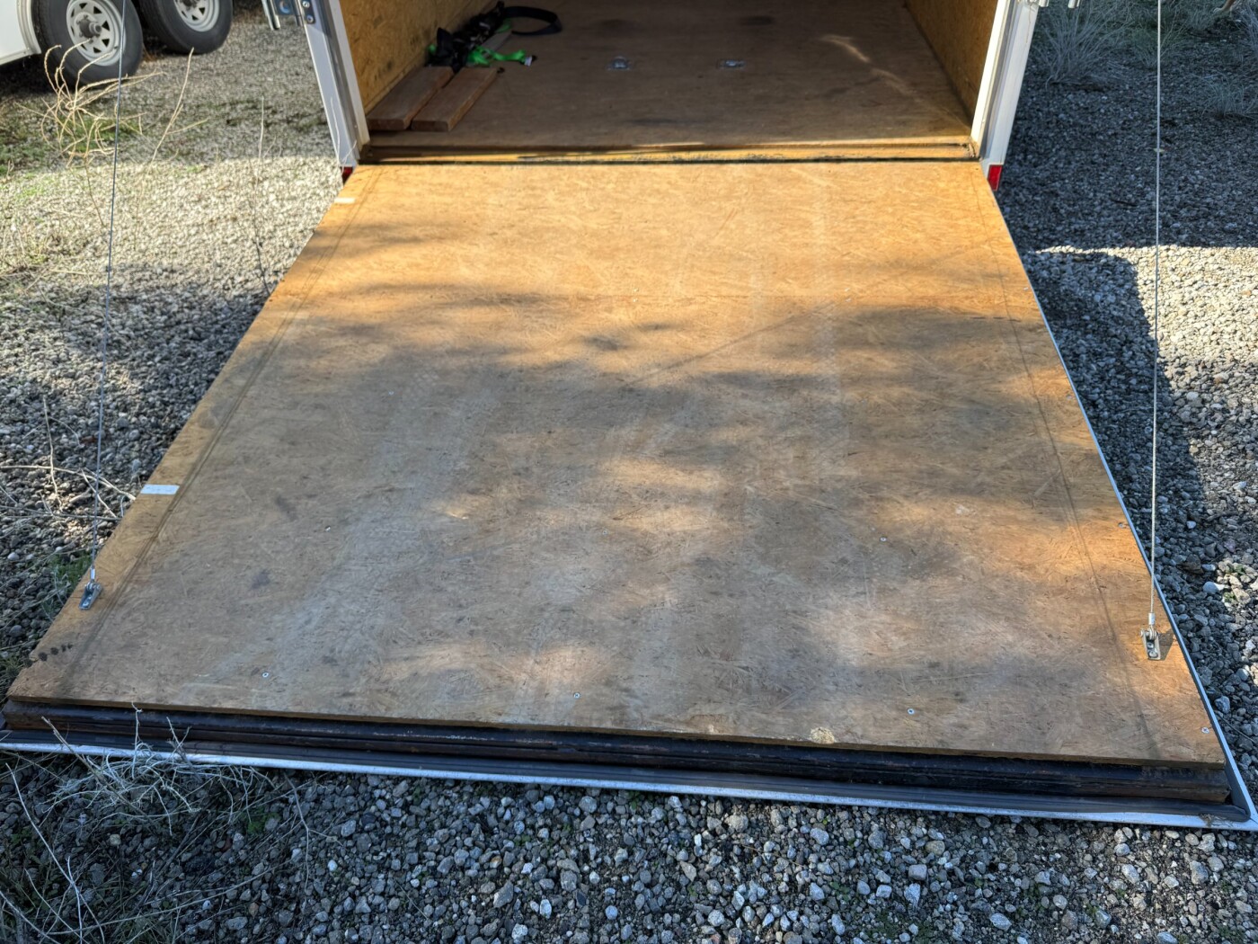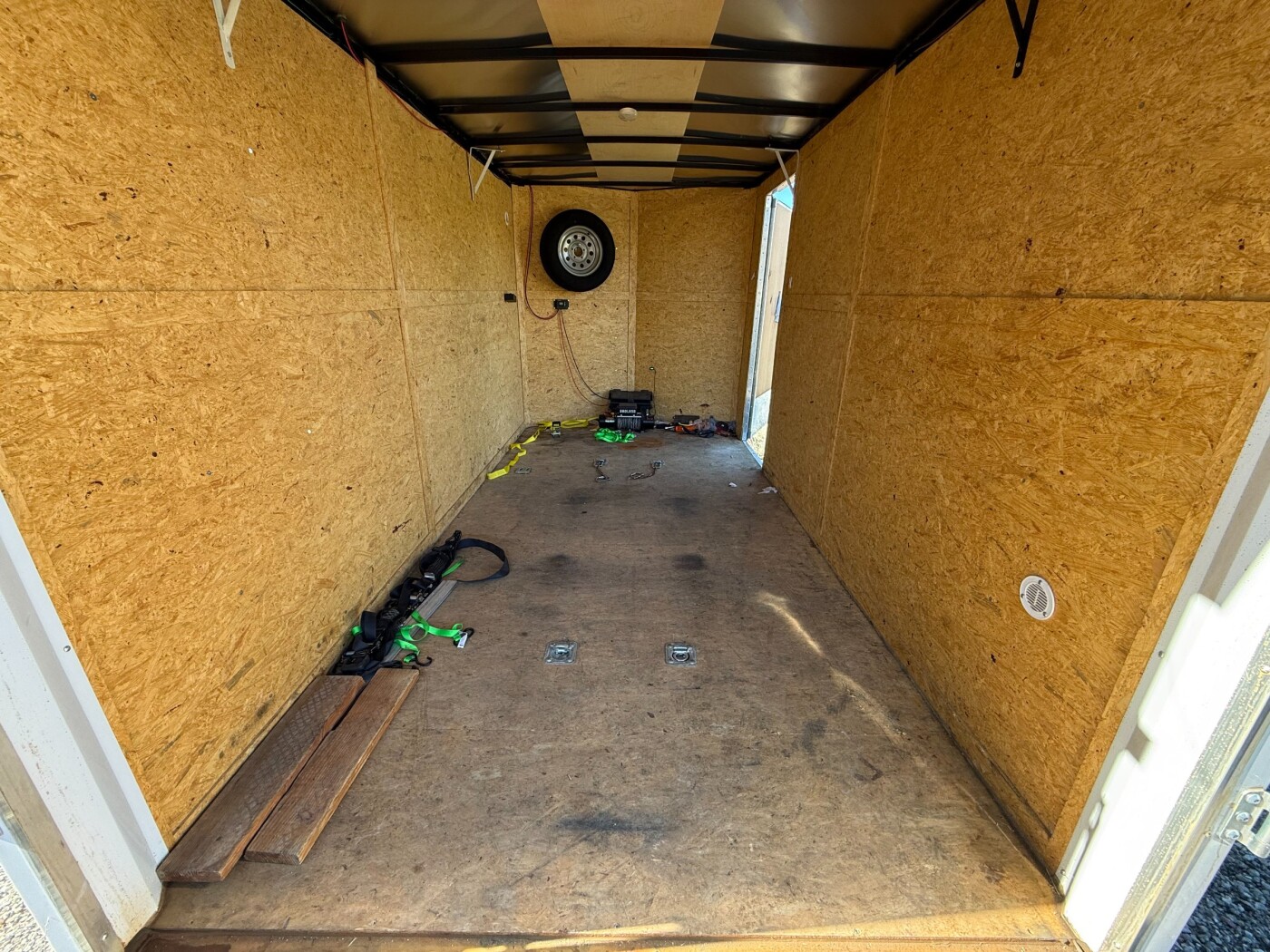 Excellent 14ft by 8.5 enclosed trailer. Trailer has a winch installed inside. powered by an on board battery that is charged by a solar panel on top of the trailer. Ramp door opening is about 7ft.