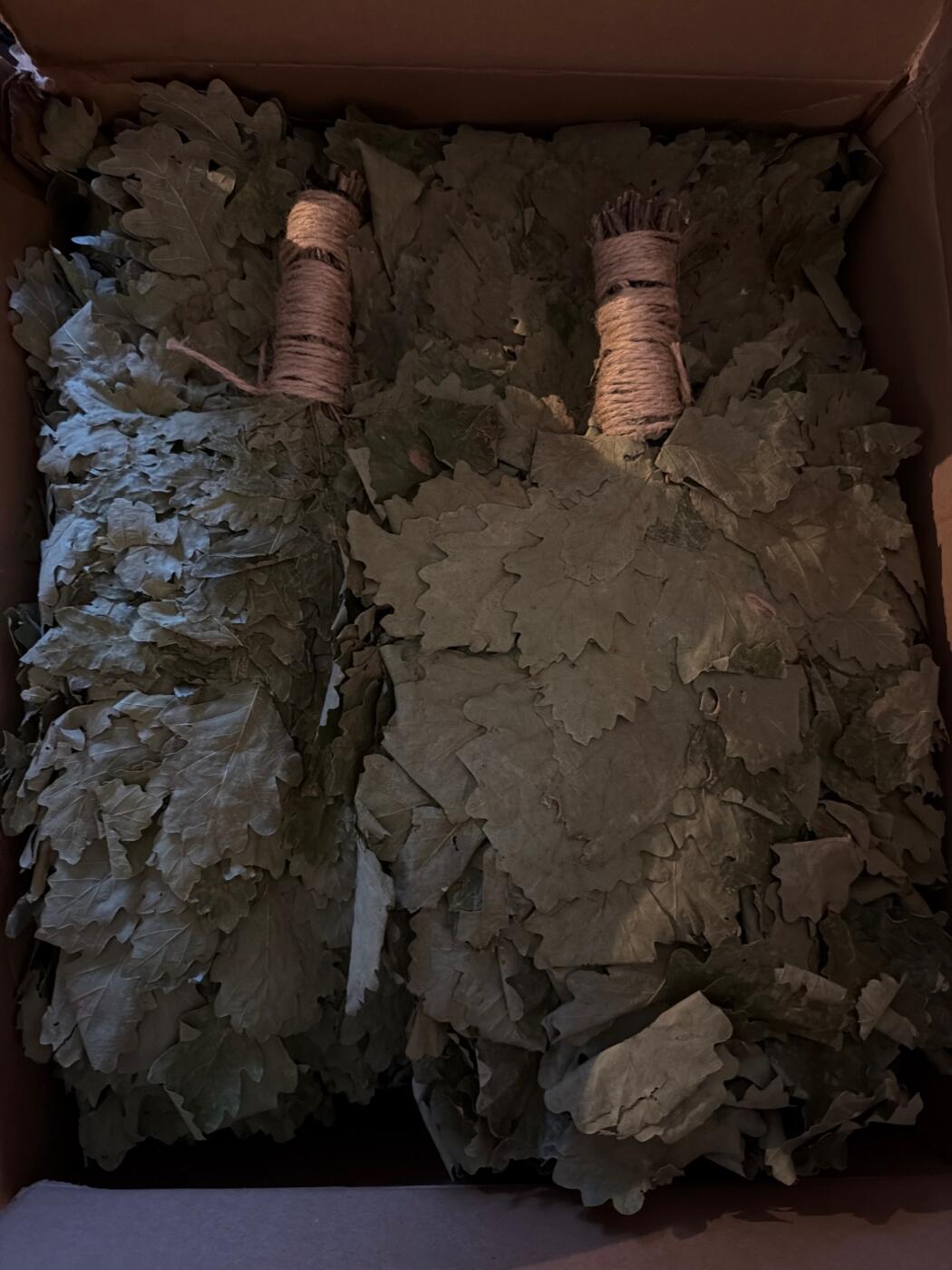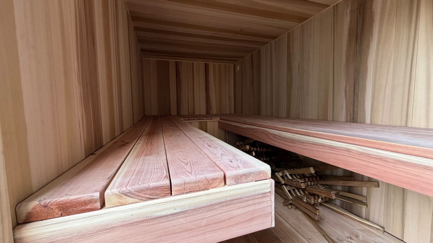 The sauna is fully equipped and ready for immediate use. It comes with multi-level bench seating, a complete off-grid lighting system, outdoor shower, and a full 100-gallon water tank included. Firewood and traditional sauna whisks (veniki) are also included in the price, allowing for a complete, authentic sauna session without any additional preparation.