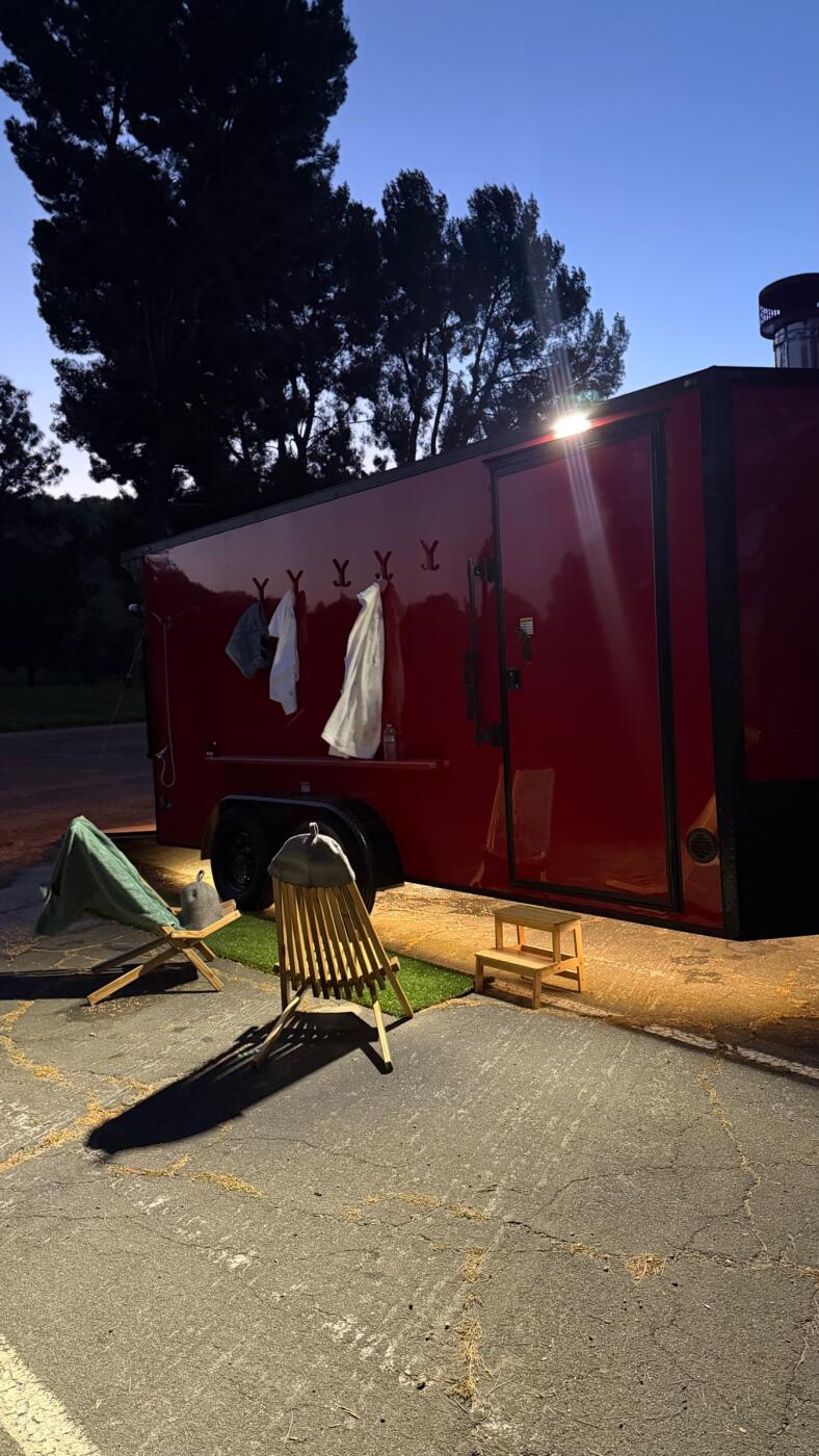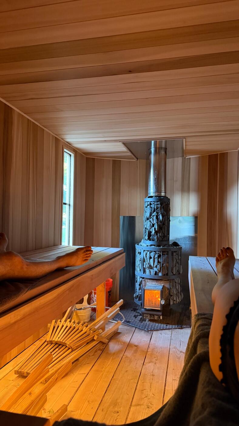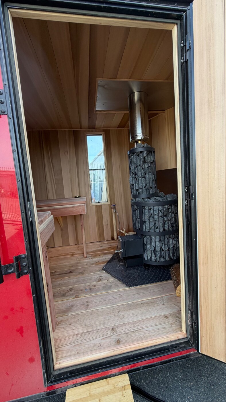This is a custom-built 7x16 wood-fired mobile sauna powered by a premium Harvia stove. The interior is finished in red cedar and fully insulated for maximum heat retention, delivering an authentic high-temperature sauna experience.