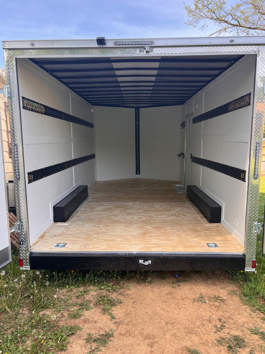 Heavy-duty and ready to haul with a 7,000 lb GVWR and dual axles for stability. Features barn doors, E-track tie-down rails on the walls, and heavy-duty steel D-ring anchors in the floor—perfect for securing equipment, vehicles, or cargo safely.