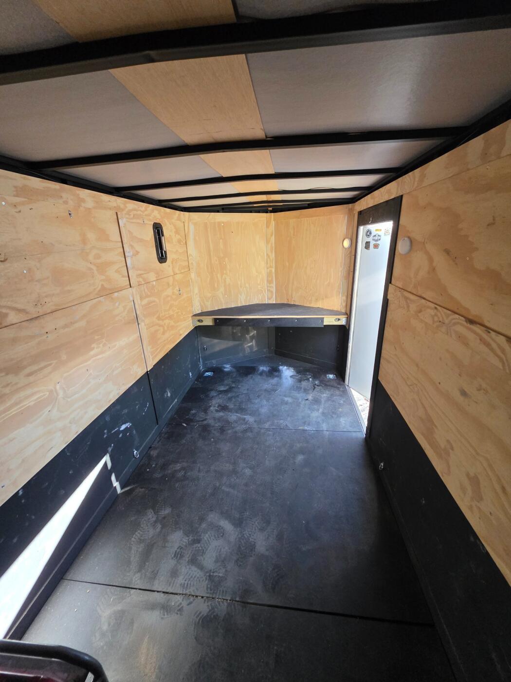 This trailer is equipped with a thick foam protective floor, a work bench in the back, a locking side door, and a rear door ramp. It has side vents for cooling that can be opened or closed as desired.