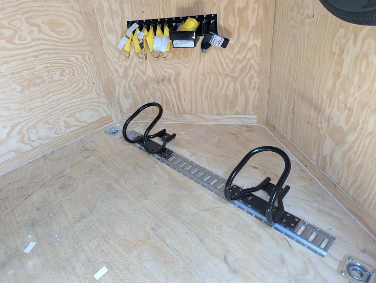 E-track on walls and floor (at the front) for motorcycle chocks, etc. (see picture).