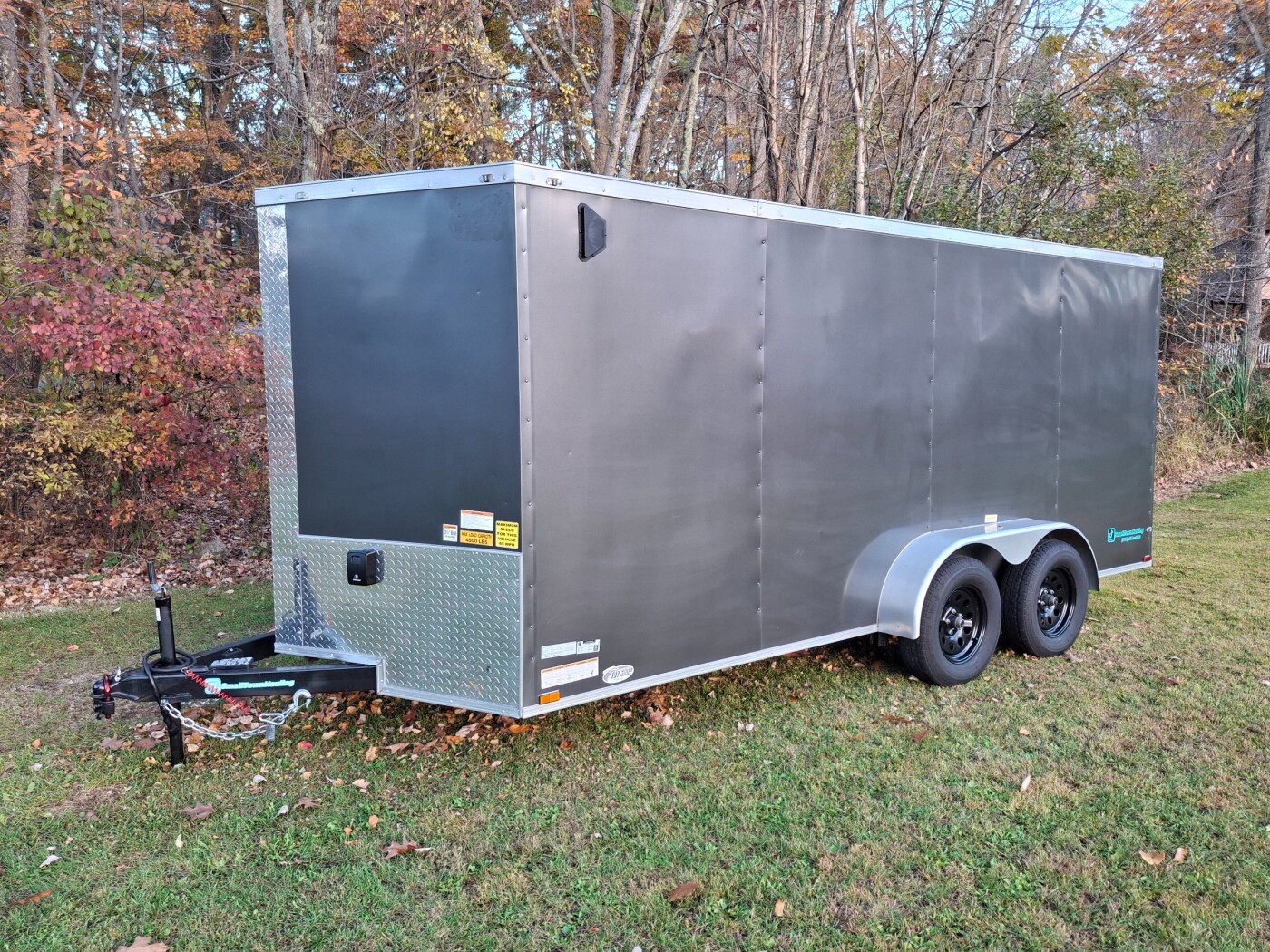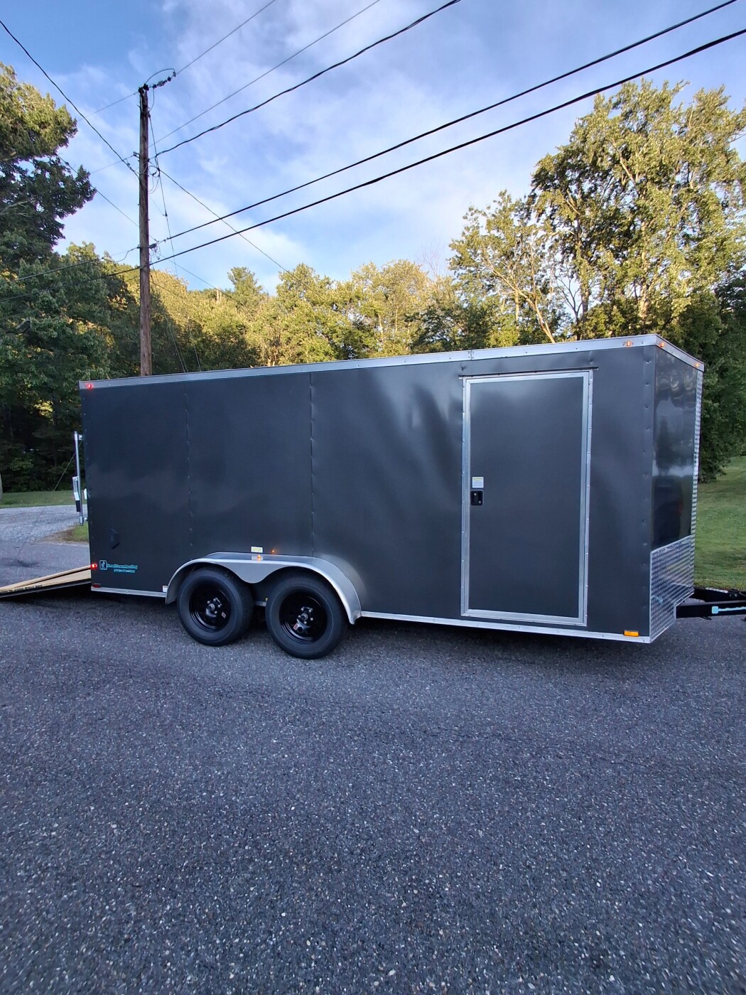 Enclosed trailer with E & X Tracks on the floor and walls with adjustable eyelets, all straps included with 3 motorcycle wheel chocks. 2 wheel hand cart included for bulk items like boxes and furniture. 7K GVWR has a payload of 4,500lbs