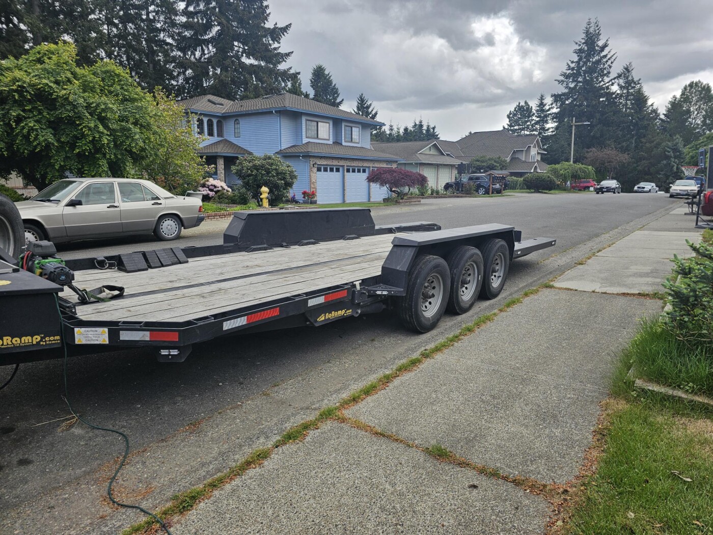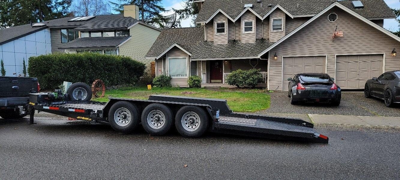 Contractor-grade Kemco U-24 No Ramp hydraulic tilt deck trailer w/ 13.5K winch (synthetic), tri-axle torsion, electric brakes, D-rings + stake pockets. Pickup Federal Way 98023.