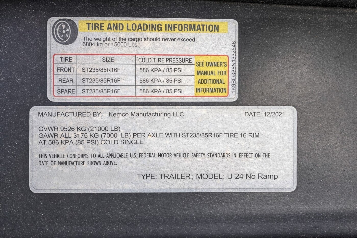 Verified Specs: GVWR 21,000 • Payload 15,000 • 3×7K torsion axles • ST235/85R16F @ 85 PSI • Electric brakes • Winch 13.5K • Model U-24 No Ramp