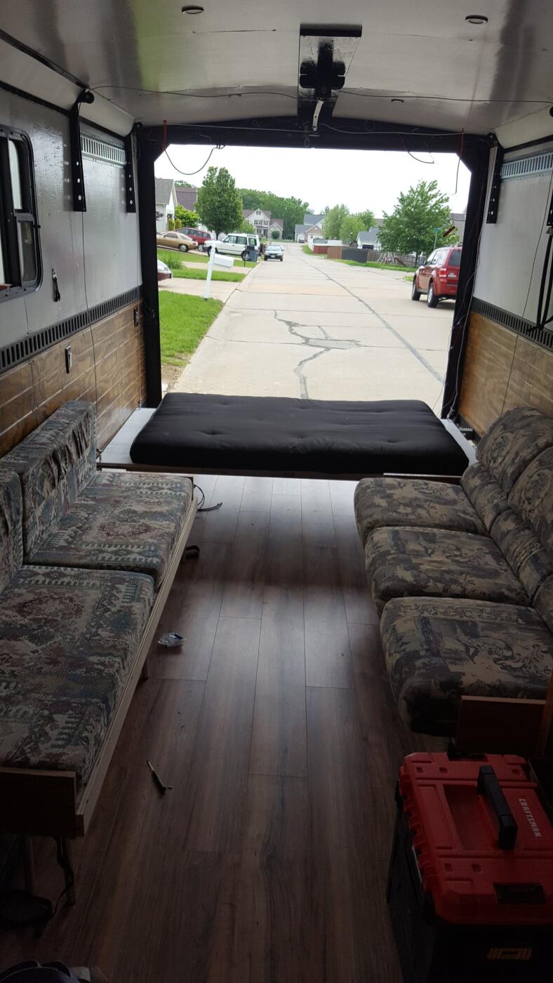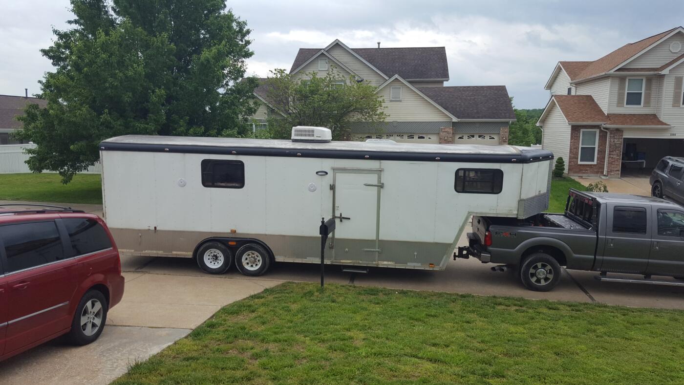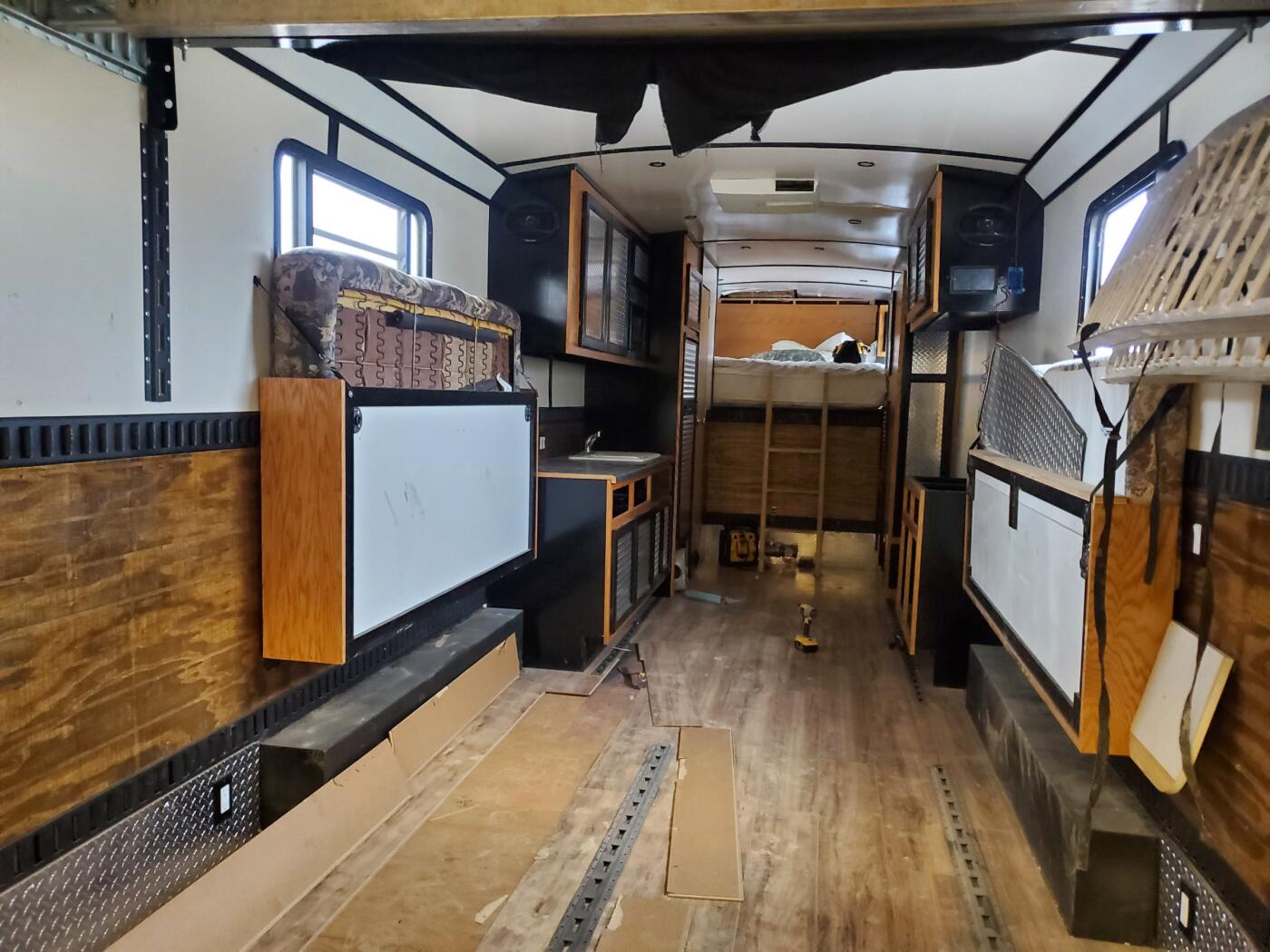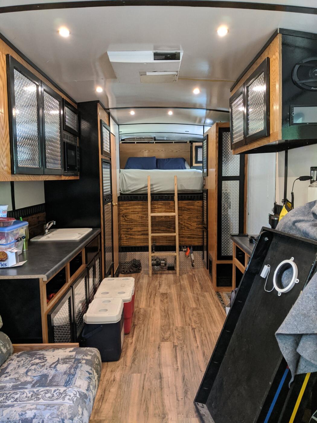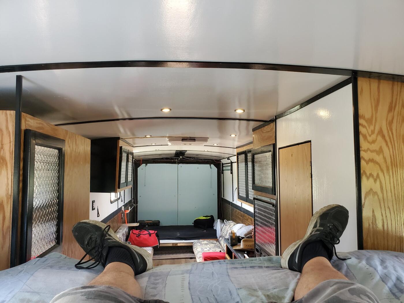32ft converted trailer to a toy hauler by the owner and shop teacher himself. 24ft on the floor, 8ft in the neck with a queen bed. "10ft garage" but will haul up to 2 more atvs depending on lengths, or 4 atvs. Cargo rear doors, etrack on floor and walls for securing toys and gear. Ramps included. Bring your own bedding. No water at this time. 50 amp electric, and rooftop AC.