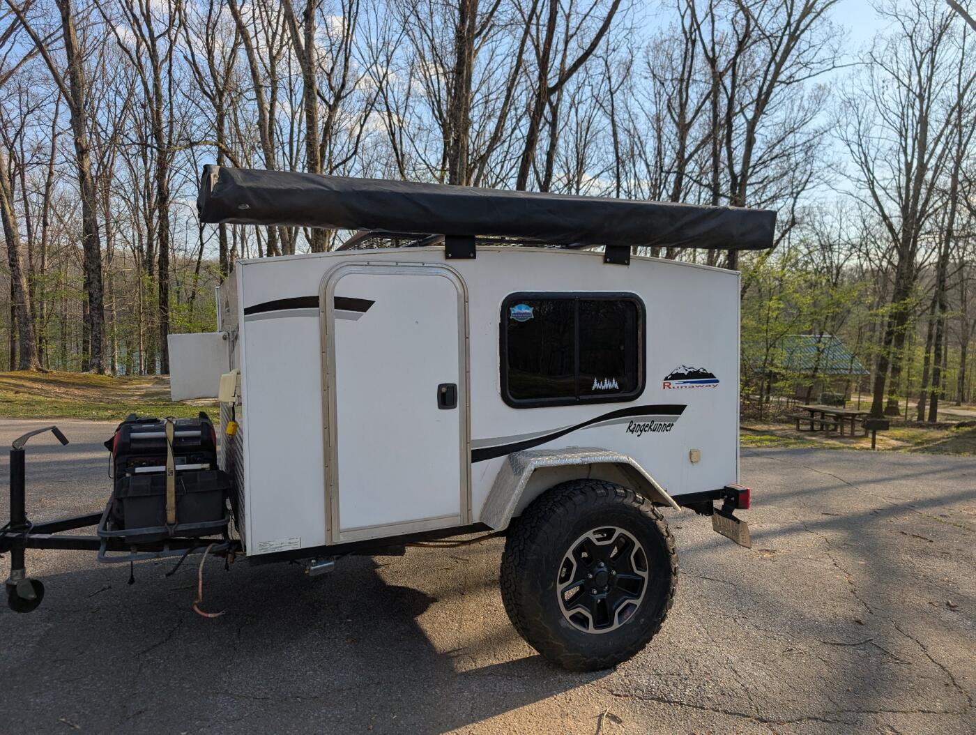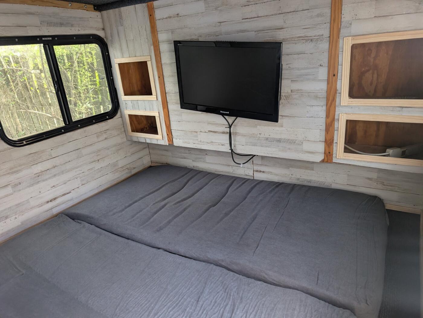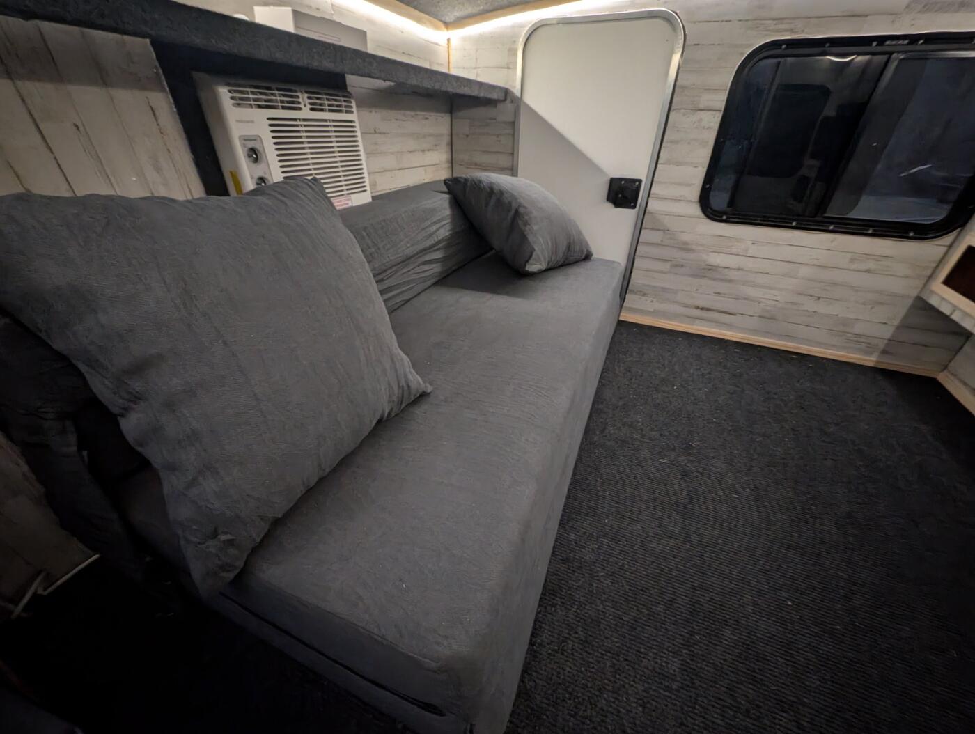Want to go camping but not in a tent? This is a small and light weight camper that is easy to pull. It has ac, bluetooth speaker, 270 awning with addon room and a small cook stove/grill. It has a 60" wide convertible sofa/bed, no bedding so provide your own or a sleeping bag. No smoking inside of the camper