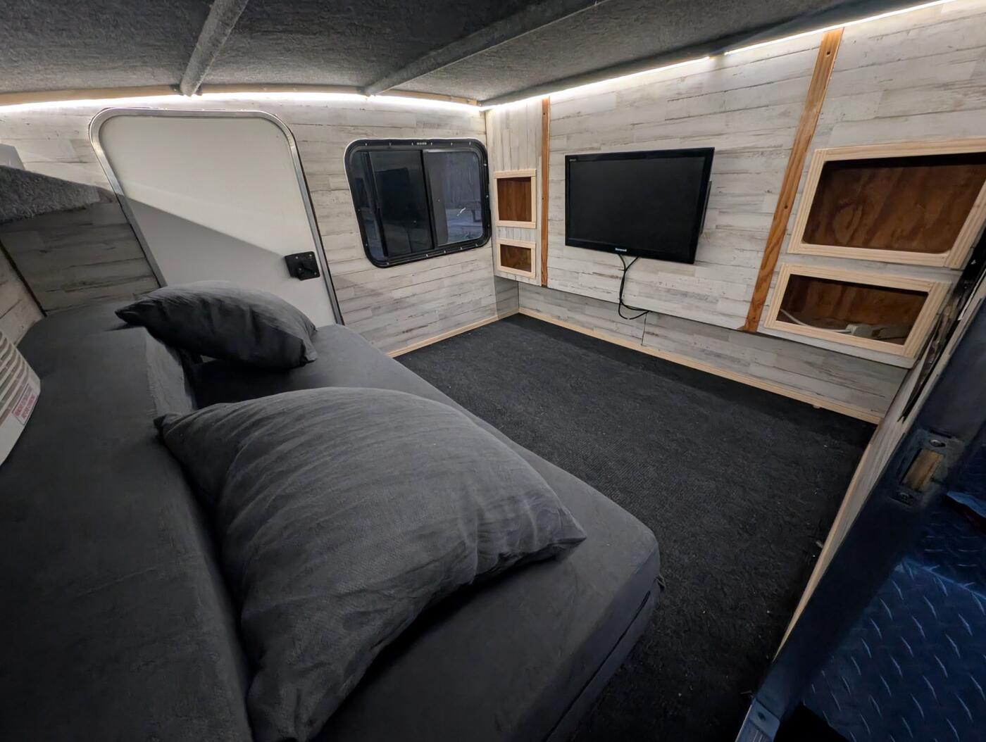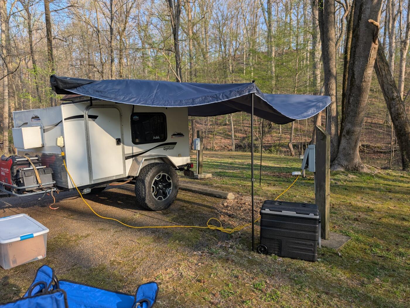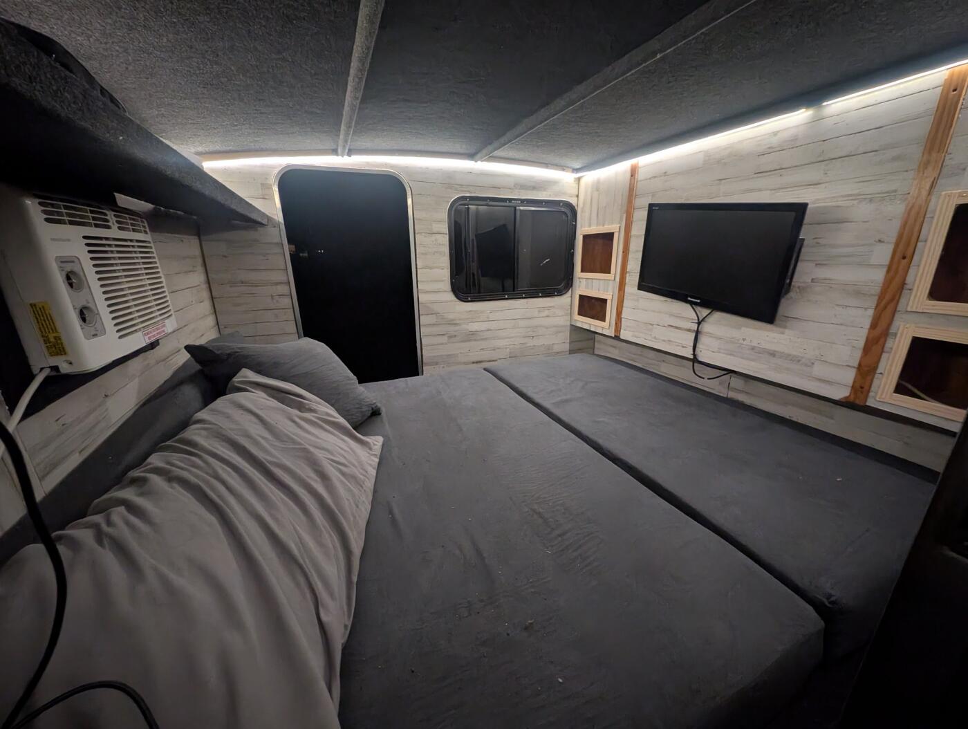 Want to go camping but not in a tent? This is a small and light weight camper that is easy to pull. It has ac, bluetooth speaker, 270 awning with addon room and a small cook stove/grill. It has a 60" wide convertible sofa/bed, no bedding so provide your own or a sleeping bag. No smoking inside of the camper