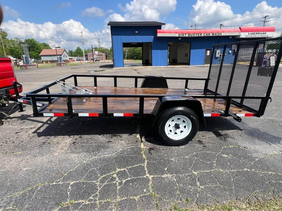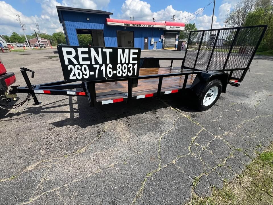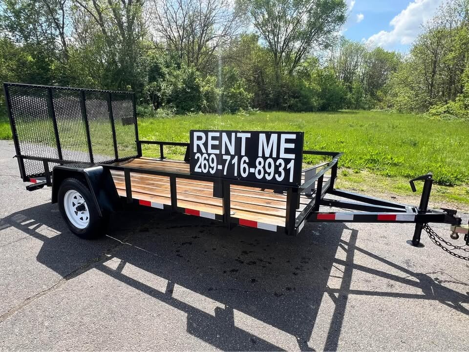 6'x12' Utility trailer with rear drop gate. 2,500 lb capacity, Multiple tie down points with D-rings on the floor, Motorcycle wheel chock to secure the front tire and stabilize the bike. Comes with straps to secure what you are hauling. Perfect for motorcycles, golf carts, quads and SxS (side by sides).