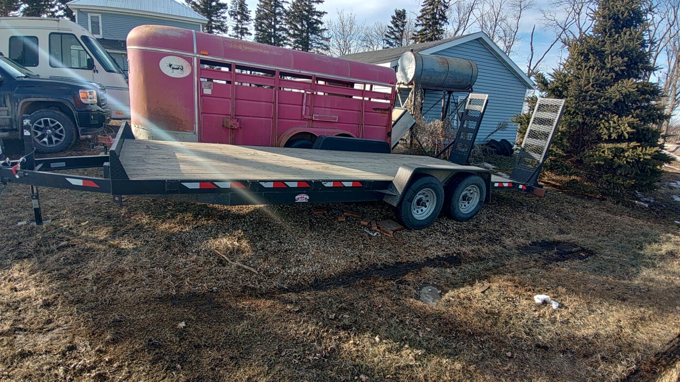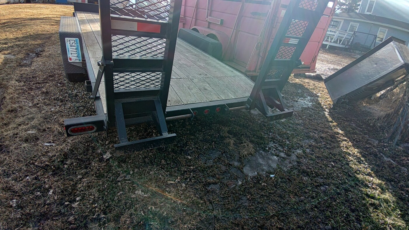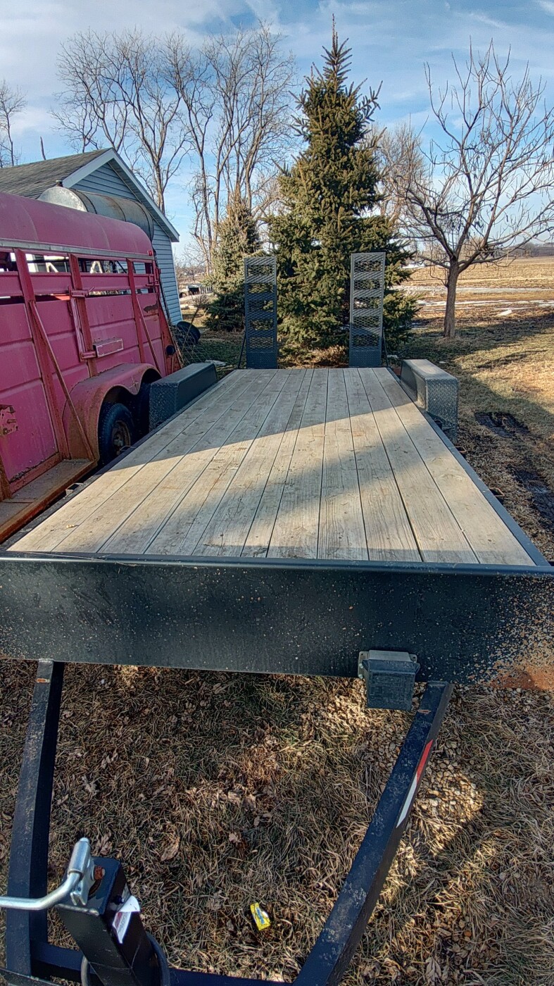 20 foot deck with 2 foot dove tail and adjustable width loading ramps. 10,000 GVWR 2 5/16 ball 82" between fenders